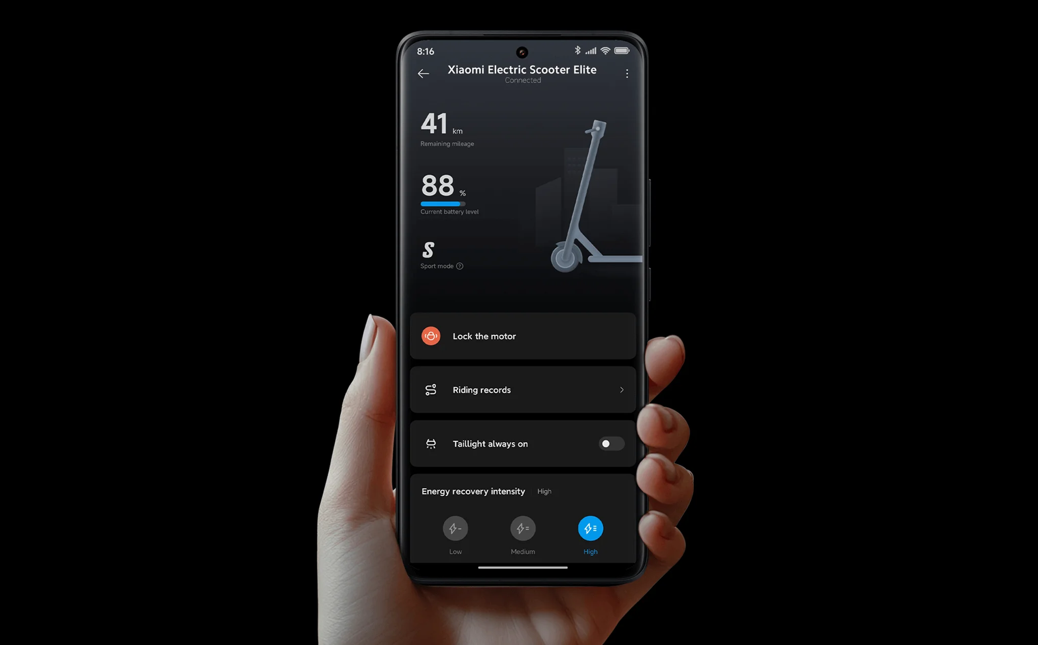| Особенности | 3 скоростных режима, cистема рекуперации кинетической энергии, бесщеточный двигатель, влагозащита IPX5, задний стоп-сигнал, система интеллектуального управления BMS, указатели поворота |